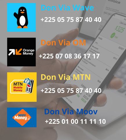 Votre contribution est essentielle pour nous aider à concrétiser nos projets. Après avoir effectué votre don via les numéros ci-dessous, nous vous invitons à remplir le formulaire de contact afin de nous notifier et de recevoir un suivi personnalisé.